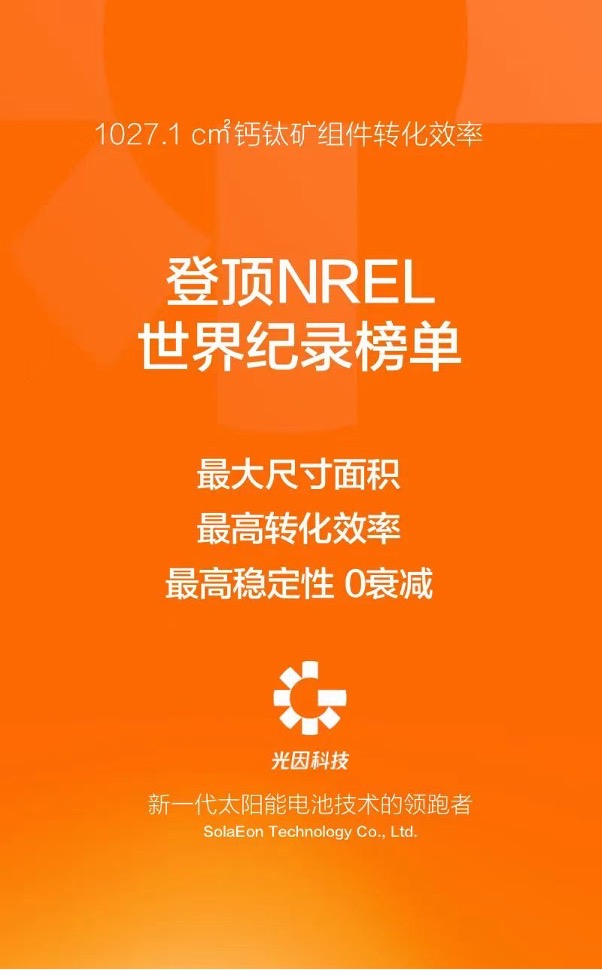 光因科技研发的大尺寸(光照面积1027.1 c㎡)钙钛矿太阳能电池组件,在NREL进行的最高效率点追踪输出(MPPT)的严格测试中实现了零衰减,其稳态效率认证达到19.2%,是NREL所有纪录中钙钛矿单节太阳能电池组件中,首个突破1000c㎡级的大尺寸组件,成为目前世界纪录中最大面积、最高认证效率的钙钛矿太阳能电池组件,创造了新的历史。