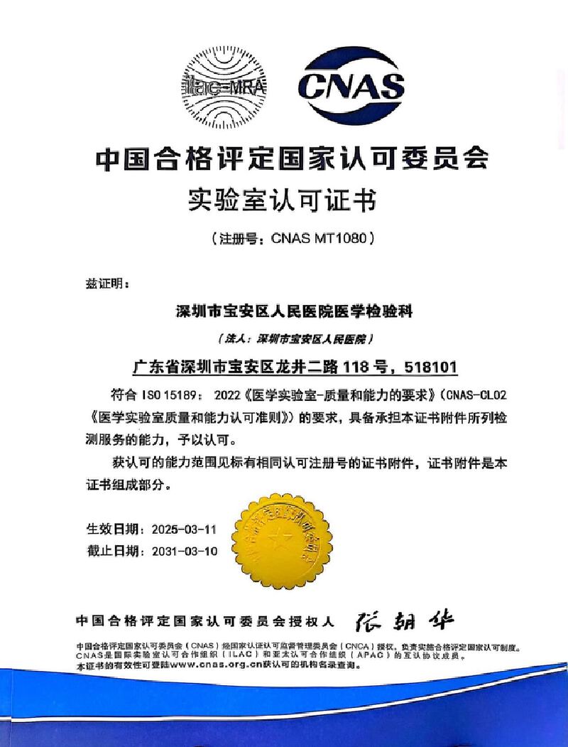 日前,中国合格评定国家认可委员会(CNAS)正式授予宝安区人民医院医学检验科ISO15189实验室认可证书,标志着该科在质量管理体系和技术能力方面达到国际标准。