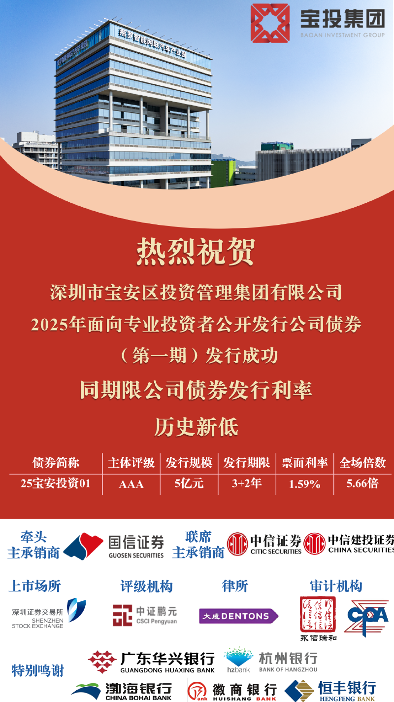 当天,宝投集团在深圳证券交易所面向专业投资者第二次公开发行公司债券,发行规模5亿元,期限3+2年,全场倍数5.66倍(申购资金总额超28亿元),利率1.59%。本次债券发行利率创全国同期限公司债历史新低,充分体现了资本市场对宝投集团综合实力和发展前景的高度认可,更是彰显了对宝安区域经济发展的坚定信心。