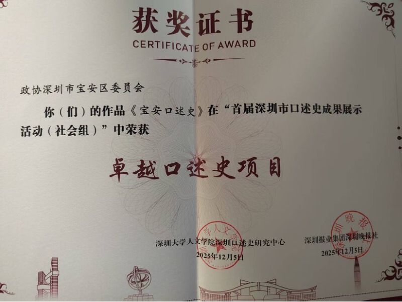 12月5日,首届深圳市口述史成果展示活动在深圳大学粤海校区本原楼举行。活动现场揭晓了社会组与校园组的年度口述史项目、卓越口述史项目及优秀口述史项目。由宝安区政协联合宝安日报社开展的《宝安口述史》项目获评“卓越口述史项目(社会组)”。